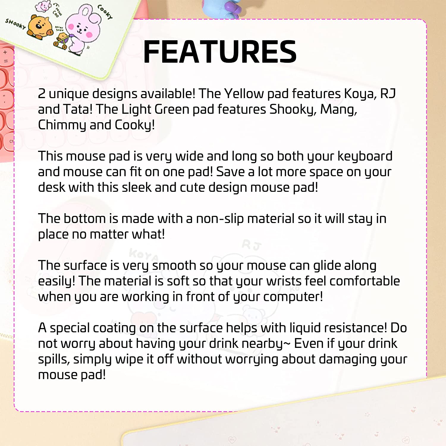 - 2 unique designs available! The Yellow pad features Koya, RJ and Tata! The Light Green pad features Shooky, Mang, Chimmy and Cooky! This mouse pad is very wide and long so both your keyboard and mouse can fit on one pad! Save a lot more space on your desk with this sleek and cute design mouse pad! The bottom is made with a non-slip material so it will stay in place no matter what! The surface is very smooth so your mouse can glide along easily! The material is soft so that your wrists feel comfortable when you are working in front of your computer! A special coating on the surface helps with liquid resistance! Do not worry about having your drink nearby~ Even if your drink spills, simply wipe it off without worrying about damaging your mouse pad!