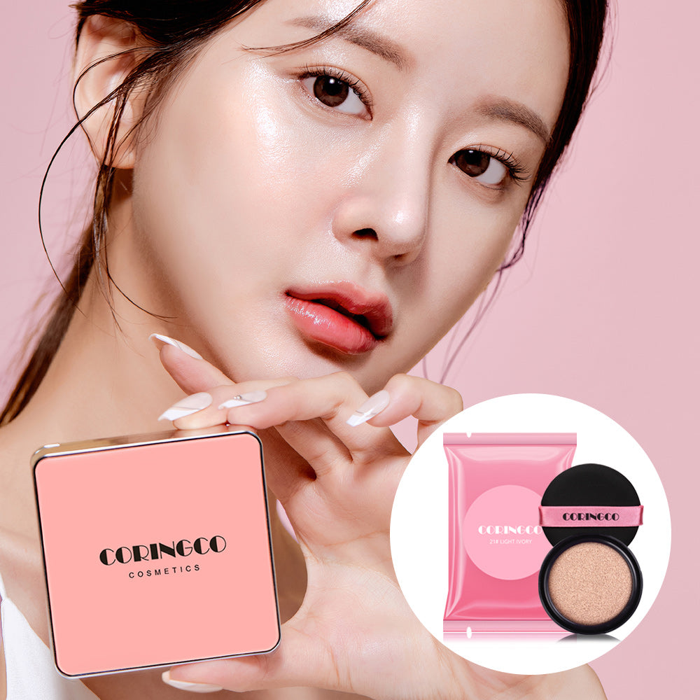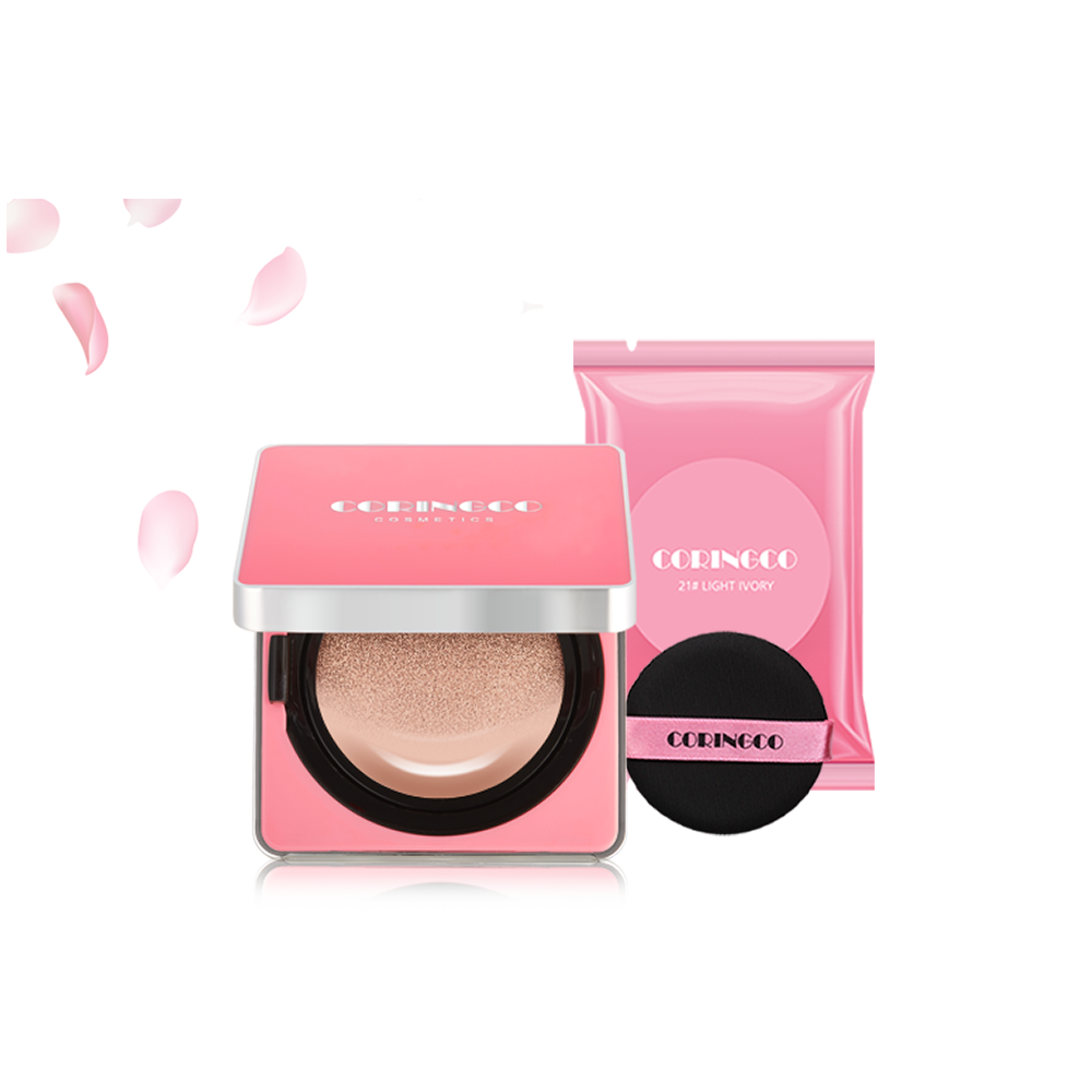 Lightweight Coverage: The CORINGCO Cherry Blossom Water Light BB Cushion in 21 Light Ivory provides a feather-light, buildable coverage that evens out your skin tone without feeling heavy.