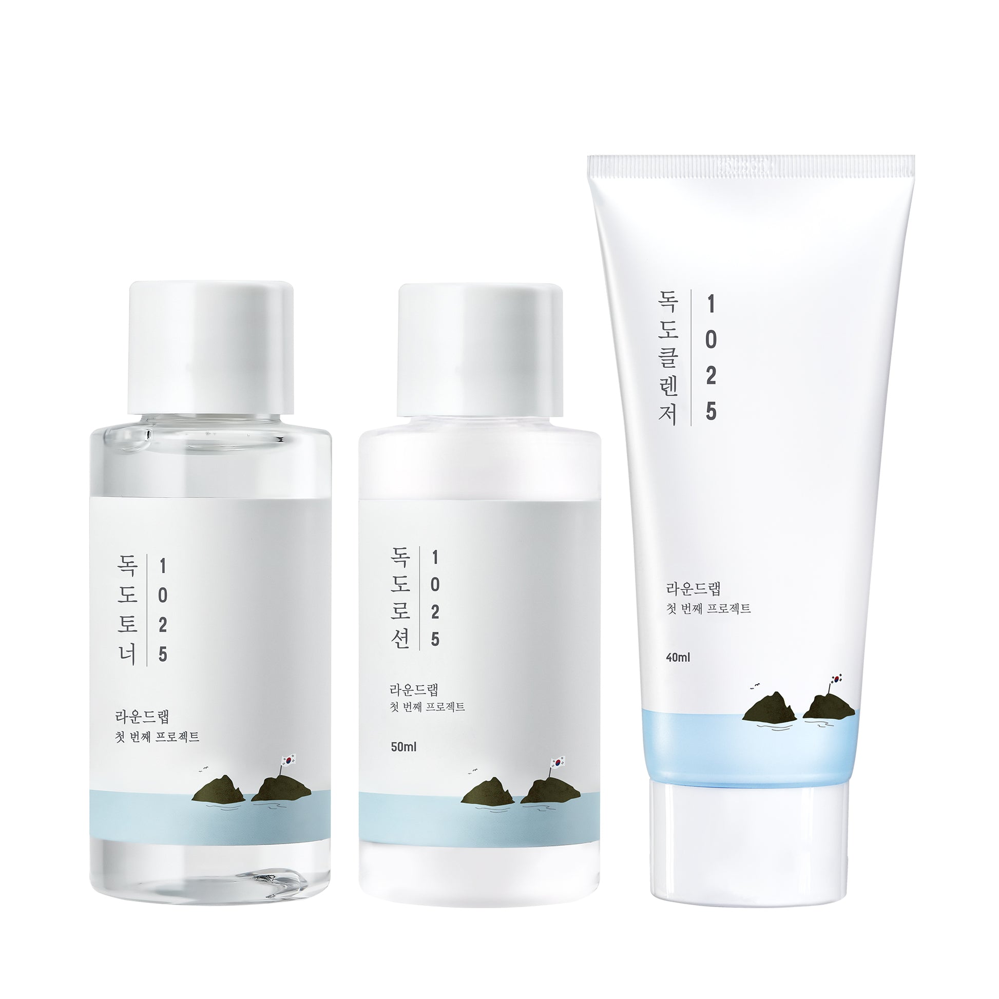 ROUND LAB's simple and trust-able skin care set which consists of 50 ml Dokdo Toner, 50ml Dokdo Lotion and 40ml Dokdo Cleanser.